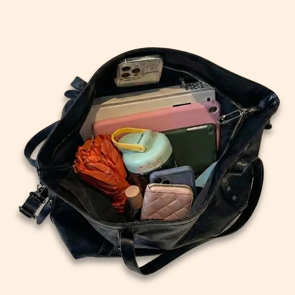 L’Esprit Rétro-Chic Revisité À la recherche du parfait sac à main pour aller en cours ? Ce modèle vintage en simili cuir noir incarne l’élégance intemporelle et s’impose comme l’indispensable des étudiantes et jeunes actives au style affirmé. Sa teinte noire classique s’associe facilement avec toutes vos tenues de la semaine.
