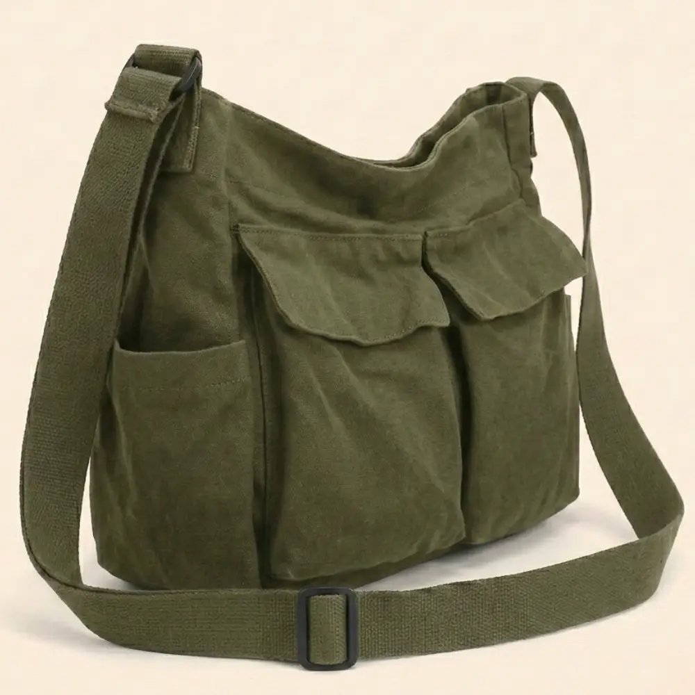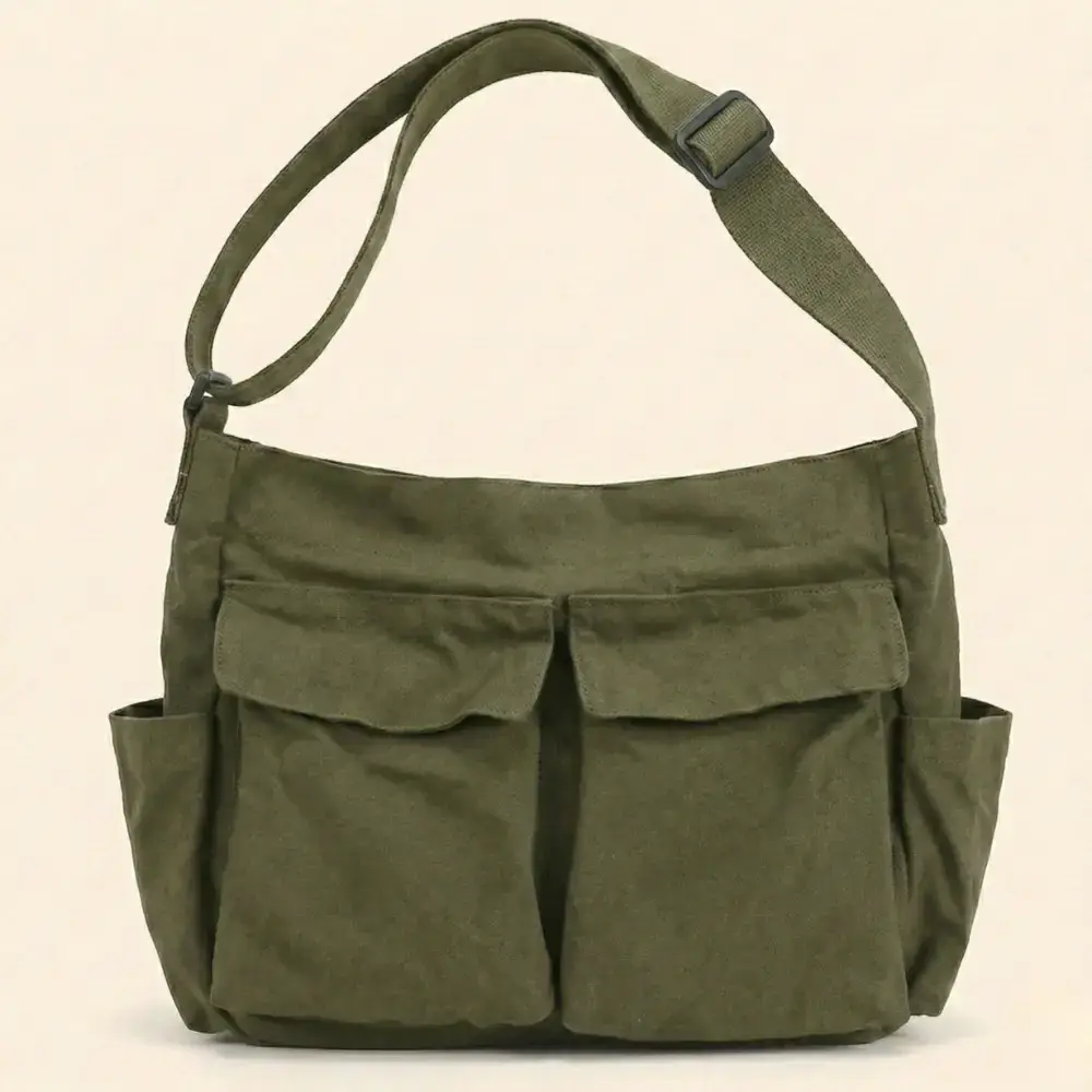 Le sac bandoulière pour les cours par excellence : une toile vert khaki ultra-résistante, un volume XXL et un design utilitaire rétro pour transporter toutes vos affaires avec un style affirmé ✨. Découvrez aussi ce modèle en : [Noir] 🖤